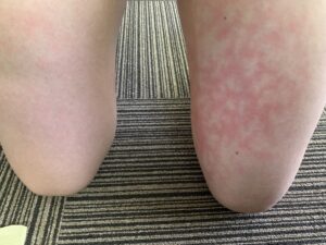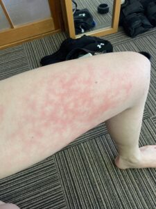 今日は日中37℃(バイクの気温計)まで気温が上がり、また、道路がものすごく渋滞していたため、帰宅後太ももがこのようになっていました